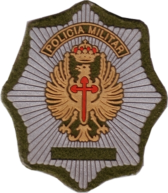 Sin referencia oficial (hacia 1990) Placa de ocho ráfagas de plata sobre la que va el emblema del Ejército, por encima POLICÍA MILITAR y por debajo un número de cinco cifras. Las dos primeras corresponderían al número de la Compañía y las otras tres al que tiene asignado el que la ostenta. Eje menor de cincuenta y dos milímetros y el mayor de sesenta y dos |