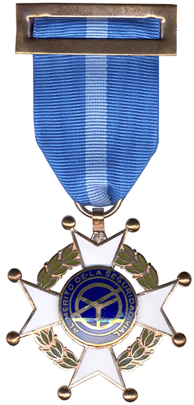 Cruz de cuatro brazos iguales esmaltados de blanco, cuyos extremos, formando un ángulo entrante, terminan en globitos. Tanto el metal, como el filete y los globitos son de bronce. Entre los brazos lleva una corona de hojas de laurel. El anverso lleva un centro circular de color azul, que lleva un volante de tres radios sobre dos líneas que convergen en la parte inferior izquierda. Alrededor entre dos filetes la inscripción AL MÉRITO DE LA SEGURIDAD VIAL
